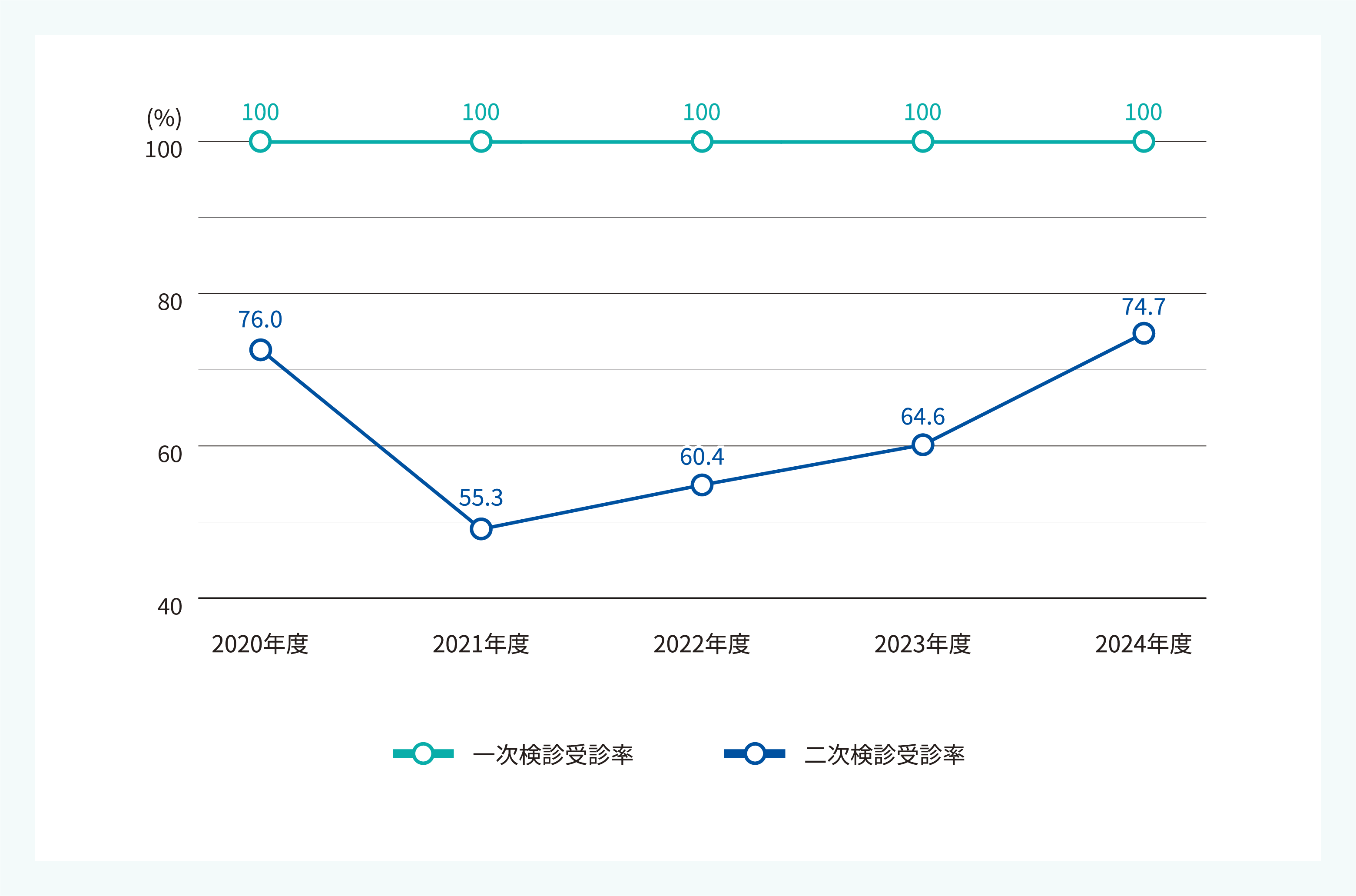 一次健診については、早期の受診案内や定期的な受診状況の確認、健康相談窓口の設置といったフォローの徹底に加え、健康診断に関するセミナーの開催や就業時間内で受診可能な仕組みを整えており、受診率は毎年100%を継続しております。 課題である一次健診受診後の二次健診(再検査)については、2023年度より健康管理システムの導入によるフォローの迅速化や休暇制度を改定し積立休暇を利用可能にするなど、各種施策を実行しており、今後の受診率改善に向け、取り組んでいます。