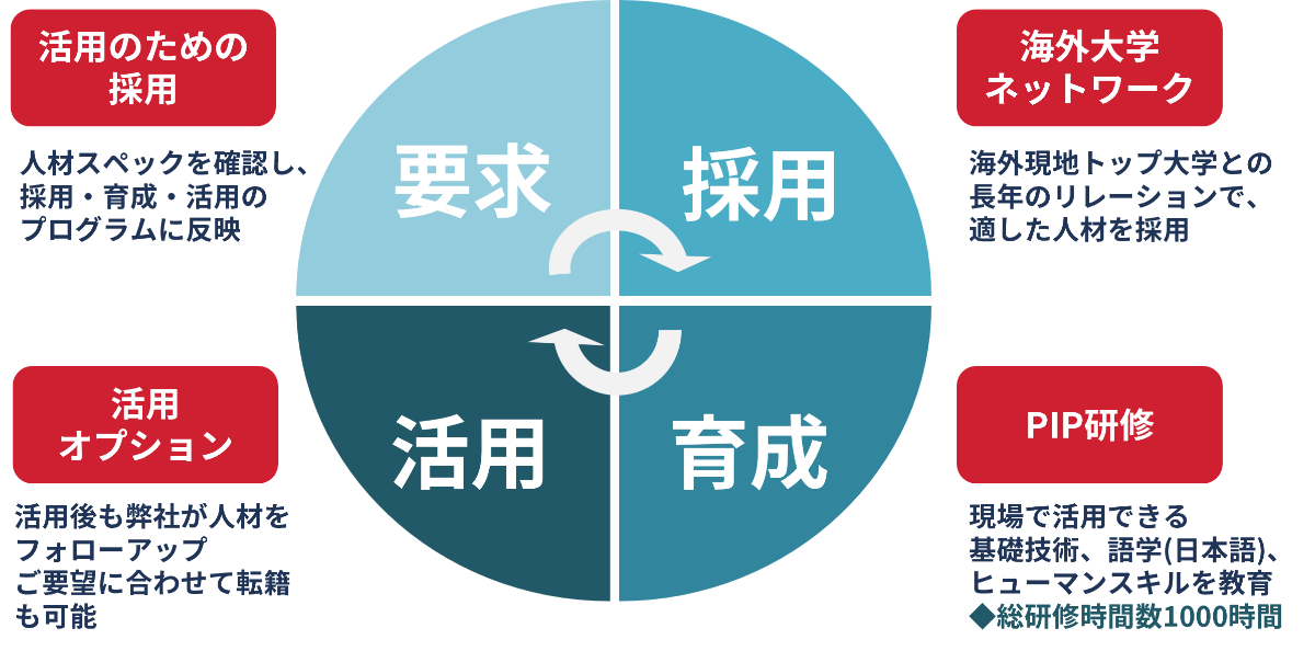 海外トップ大学を卒業した若い優秀な人材を厳選し、IT人材として採用・育成した上で、現場に送り出すシステムを準備しています。 通常の人材派遣と異なり、期待される要素スキルや素養に合わせて採用し育成する点を特徴としています。 独自の人材育成・活用システム「PIPプログラム」により企業ニーズを踏まえ、要求内容を研修プランに組み込むため、ミスマッチの不安を低く抑えることが出来ます。